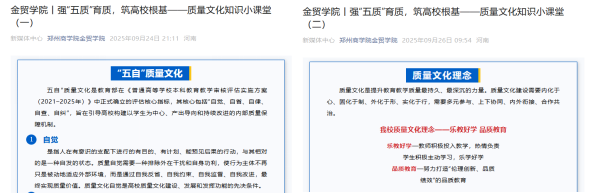 同时,为进一步深化师生对质量文化的学习和研讨,学院公众号推出质量文化知识小课堂系列学习活动。公众号内容丰富多样,包括“五自”质量文化解读、学校质量文化理念、大学质量文化的理念和主张等。师生们可以通过手机随时随地学习质量文化知识,参与线上讨论和交流,形成了良好的质量文化学习氛围,师生反响热烈。