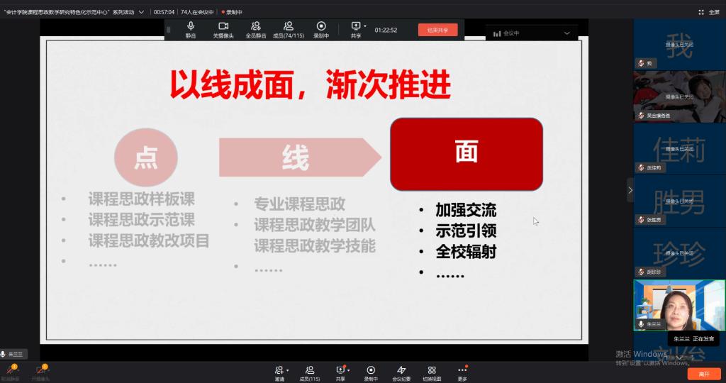 随后,常金玲教授以《面向学科的课程思政团队建设思考与实践》为题,进行课程思政建设分享。她从初心——“立德树人”教育的根本任务出发,介绍了课程思政建设的时代性和紧迫性,围绕“无课不思政,无课不能思政”的观点,以“信息管理核心课程思政教学团队”的建设为切入点,通过介绍该团队的建设路径,指出在课程思政建设过程中,要引导学生深入实践,关注现实问题,培养学生经世济民,诚信服务,德法兼修的职业素养。为更清晰的展示课程思政建设的过程,常教授以《信息管理系统》课程思政建设为例进行具体案例阐述,指出在建设过程中要坚持协同育人、精准育人、无声育人和时间育人,并提出了一个核心、两个任务、三个融合的建设目标。