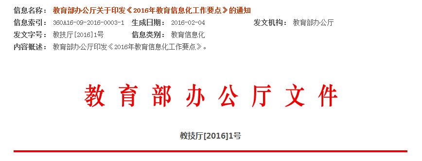 为深入贯彻落实党的十八大及十八届三中、四中、五中全会和习近平总书记系列重要讲话精神,按照第二次全国教育信息化工作电视电话会议的工作部署,我部研究制定了《2016年教育信息化工作要点》,现印发给你们,请结合本地本单位工作实际贯彻执行。