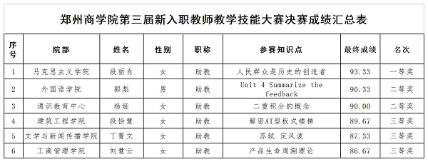 为提升我校教师教学能力,推动教师课堂教学模式创新,深入开展教学改革,鼓励教师积极钻研教学,以赛促教,以赛选优,激发教师更新教育理念和掌握现代化教育方法的热情,推动学校师资队伍建设,根据教学工作安排,我校于9月1日举办了第六届青年教师及第三届新入职教师教学技能大赛决赛。经院部初赛、学校决赛、评选委员会评议,青年教师教学技能竞赛评选出一等奖1名、二等奖2名、三等奖3名、优秀奖4名(获奖名单见图1),新入职教师教学技能竞赛评选出一等奖1名、二等奖2名、三等奖3名(获奖名单见图2),现予以公示,公示期为9月2日至9月6日。