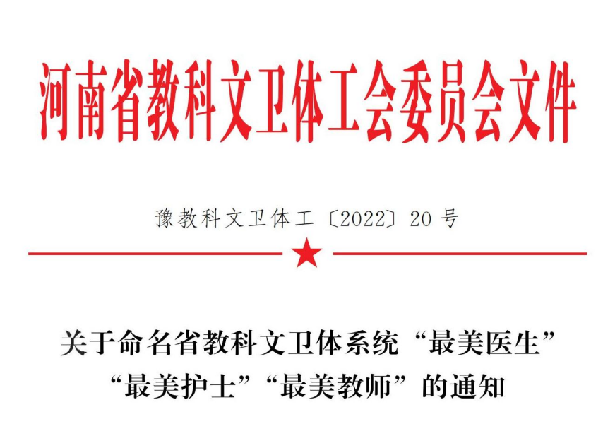 从《关于命名省教科文卫体系统 “最美医生” “最美护士”“最美教师”的通知》(豫教科文卫体工〔2022〕20号)文件获悉,经学校严格按照选拔条件和程序推荐人选、河南省教科文卫体工会组织评委审核评选并公示等环节后,我校宫玉荣老师获得河南省教科文卫体系统“优秀教师”荣誉称号。
