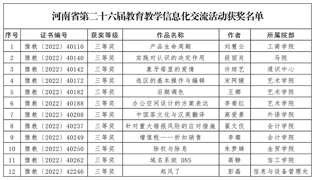 据《河南省教育厅关于公布河南省第二十六届教育教学信息化交流活动评选结果的通知》(教资保〔2022〕330号)获悉,经学校申报、专家评审、大赛组委会确认,我校11项优秀微课作品和1项优秀电视节目获奖。希望我校教师以获奖教师为榜样,主动提高信息技术应用能力和水平,推动信息技术与教育教学深度融合。