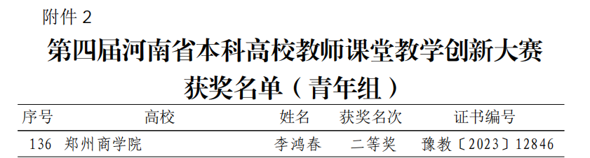 为推动高等教育课堂教学创新,提升本科高校教师教学水平和育人能力,第四届河南省本科高校教师课堂教学创新大赛决赛与2月26日-27日在河南大学举行,我校工商管理学院教师李鸿春获得二等奖。