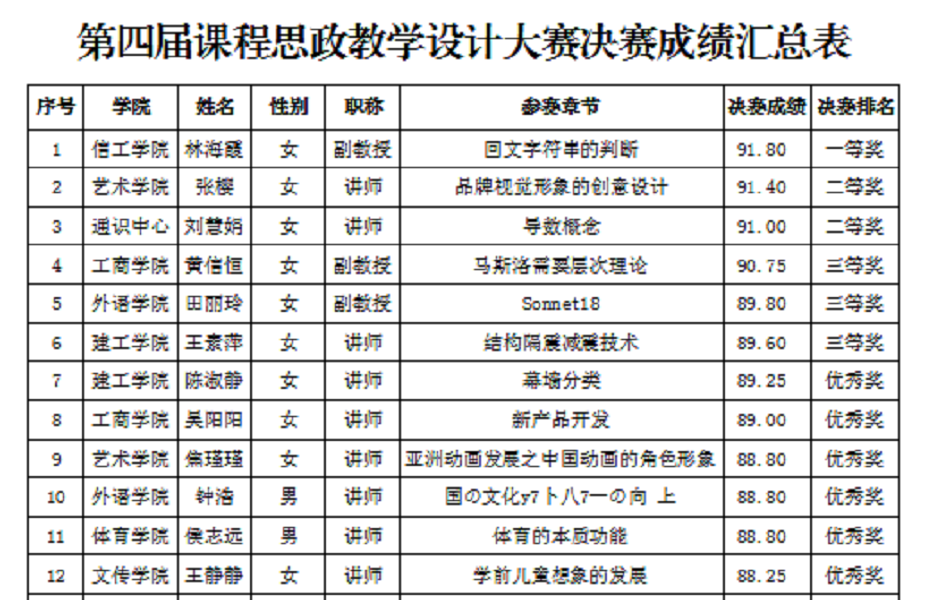 为贯彻落实《高等学校课程思政建设指导纲要》精神,全面推进课程思政建设,落实立德树人根本任务,强化课程育人导向,挖掘和丰富课程育人内涵,充分发挥课堂教学育人主渠道作用,按照本学期课程思政建设总体安排,我校于2023年3月8日-2023年5月18日举办了第四届课程思政教学设计大赛。经二级学院初赛选拔,共推选19位教师参加学校决赛,经评委现场评议,评选出一等奖1名,二等奖2名,三等奖3名,优秀奖6名(见下图),优秀组织奖:会计学院。现予以公示,公示期3个工作日(5月22日至5月24日)。