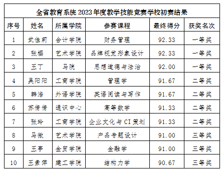 为进一步加强教师队伍建设,促进教师综合素质、专业化水平和创新能力全面提升,调动广大教师教学积极性、主动性、创造性,以赛促学、以赛促教、以赛促改,不断提高教师教学水平,根据《河南省总工会 河南省教育厅关于在全省教育系统开展2023年度教学技能竞赛的通知》相关要求,我校于6月8日-7月3日开展了此次教学技能大赛学校初赛。经二级学院初赛、学校决赛、评审委员会评议,评选出一等奖3名,二等奖4名,三等奖3名,获奖名单见下表。现予以公示,公示期5个工作日(7月3日至7月7日)。如有异议,请在公示期内反馈至教师发展中心,联系电话:0371-61070717。