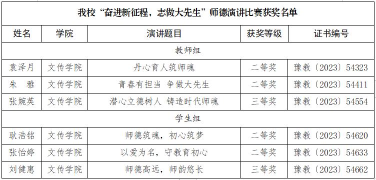 根据河南省教育厅《关于在全省教育系统开展“奋进新征程,志做大先生”师德主题教育活动的通知》(教师〔2023〕64号)精神,省教育厅在全省教育系统开展了2023年师德教育主题征文、演讲比赛和优秀案例评选活动。从河南省教育厅《关于公布“奋进新征程,志做大先生”师德主题教育征文、演讲比赛和师德师风优秀案例评选结果的通知》(教师〔2023〕291号)获悉,经学校遴选和推荐,省教育厅组织专家评审,我校师生在师德教育征文中荣获教师组三等奖5项;学生组一等奖1项、二等奖1项、三等奖2项,在师德演讲比赛中荣获教师组二等奖2项,三等奖1项;学生组二等奖2项、三等奖1项。
