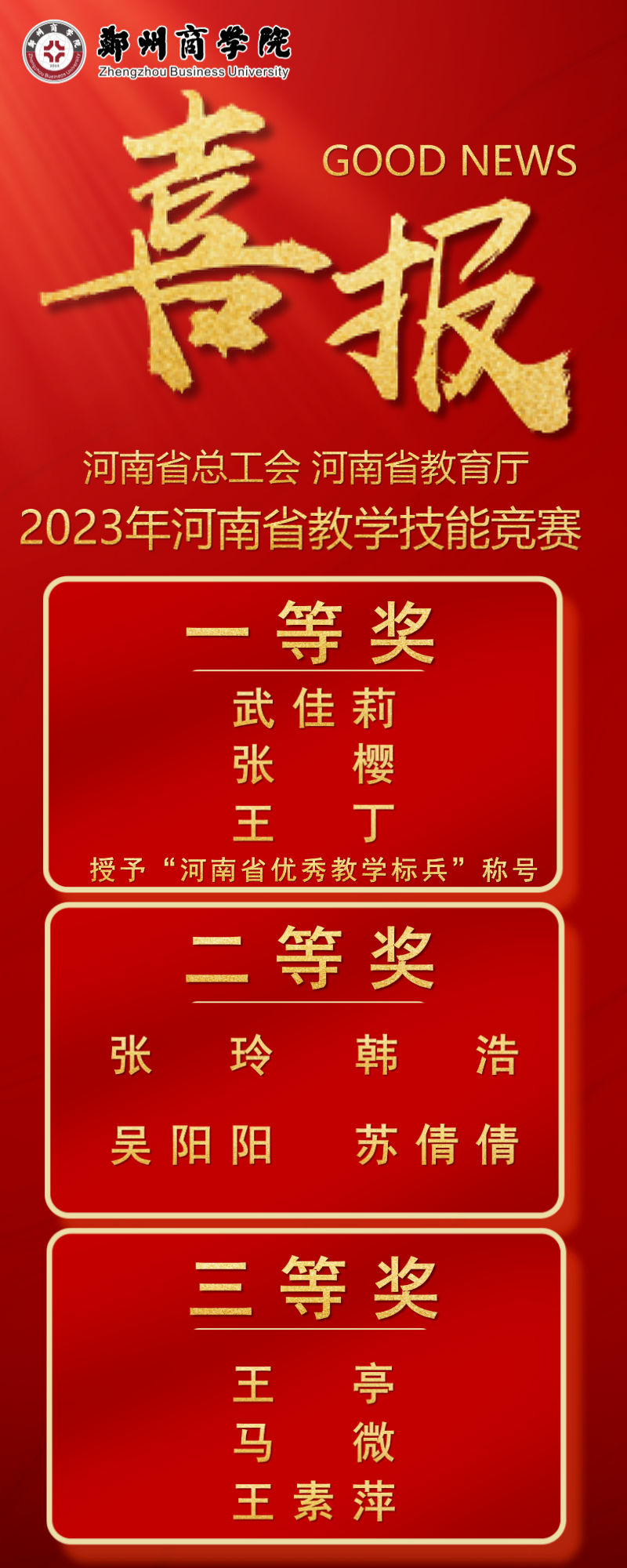 此次竞赛中,武佳莉老师获得全省高校经管科一等奖并被授予“河南省教学标兵”荣誉称号;张樱老师获得全省高校文科一等奖并被授予“河南省教学标兵”荣誉称号;王丁老师获得全省高校思政一等奖并被授予“河南省教学标兵”荣誉称号;张玲、吴阳阳两位老师获得全省高校经管科二等奖;韩浩老师获得全省高校文科二等奖;苏倩倩老师获得全省高校理科二等奖;王亭老师获得全省高校经管科三等奖;马微老师获得全省高校文科三等奖;王素萍老师获得全省高校工科三等奖。