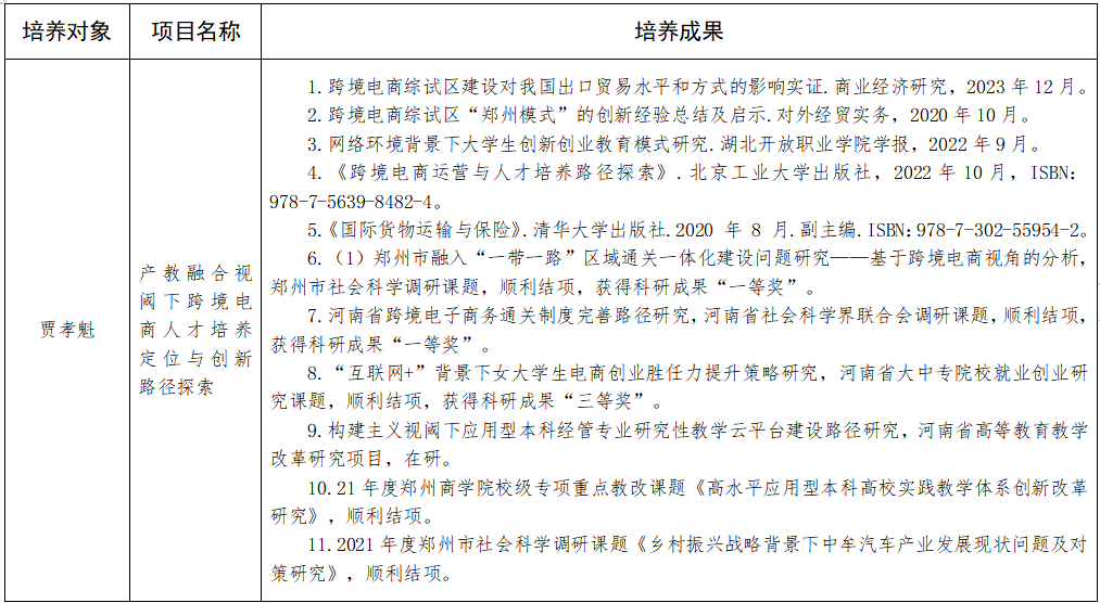 根据河南省教育厅办公室《关于对2020年度河南省本科高校青年骨干教师培养计划人选进行考核的通知》(教办高〔2024〕175号)的要求,按照我校《关于对河南省本科高校2020年度青年骨干教师培养计划人选进行考核的工作方案》安排,现将培养计划人选培养期间立项、发表、出版的相关教学科研项目、论文、著作、教材、获奖等成果材料公示如下: