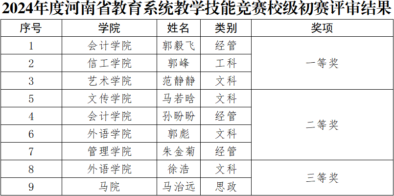 按照文件规定的参赛资格条件、获奖比例要求,学校初赛名次先后顺序,选拔出3个一等奖、4个二等奖,2个三等奖。按照公平、公正、公开原则,现将我校上报2024年度河南省教育系统教学技能竞赛评审结果公示如下: