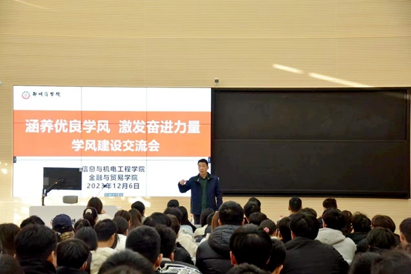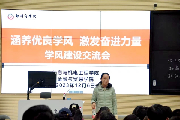 为进一步营造浓厚的学习氛围,引导学生端正学习态度,提高学习效率,加强学风建设,2023年12月6日下午,我院与金贸学院在三彩校区JT202教室联合开展主题为“涵养优良学风,激发奋发力量”的学风建设交流会。校长助理刘升阳教授、金贸学院党委书记吕鹏、副院长贾孝魁、教师发展中心副主任季艺、信工学院院长张晓冬、党委书记周余、副院长张伟华以及各学院学生代表参加本次学风建设交流会。本次学风建设交流会由张晓冬院长主持。