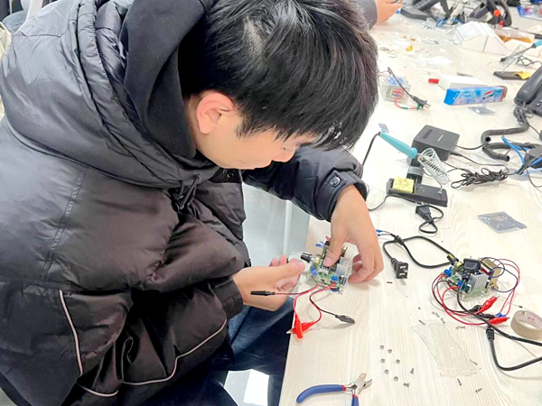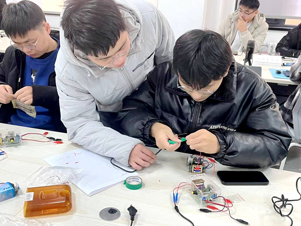 为了更好的呈现实践课程的教学效果,电气自动化教研室承担《电子工艺实习》课程的四位教师,在2023年12月19日利用休息时间在B305集中进行课程项目的原理分析和实物焊接,最后成功地把要做的实物进行了焊接和调试,并针对出现的问题,整体进行了分析,为电子工艺实习课程的开设打下了坚实的基础。