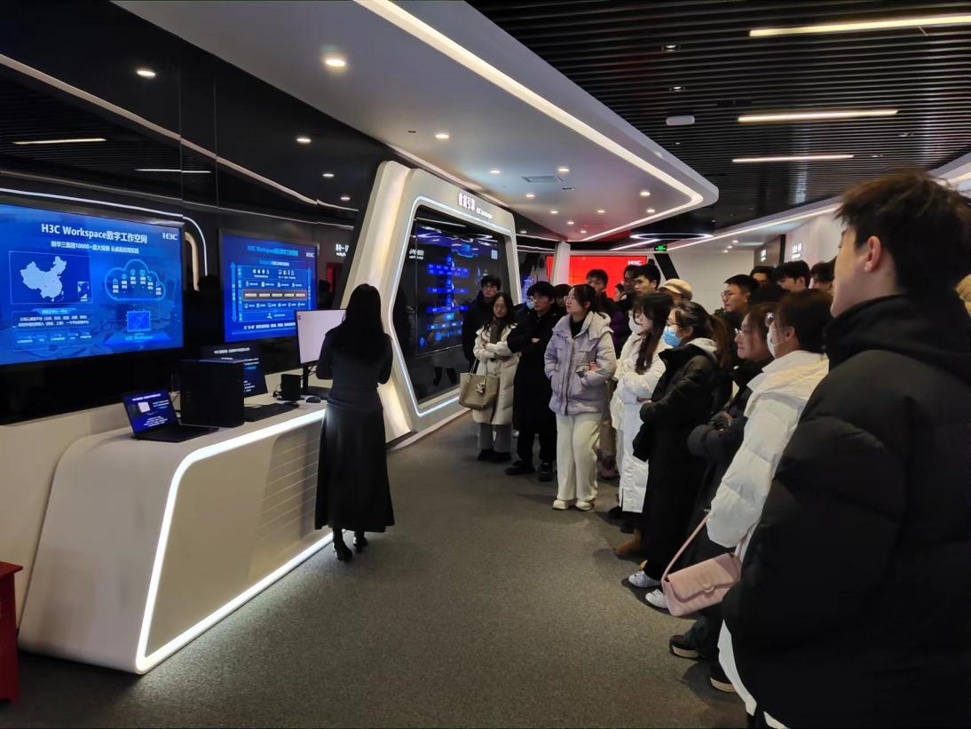 20日下午,在专业课老师的带领下,22级大数据专业和网工专业的学生乘车到郑州大数据产业园新华三大数据技术有限公司展厅进行有序参观。