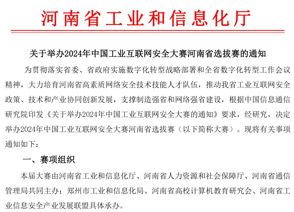 2024年9月12—13日,由中国信息通信研究院印发《关于举办2024年中国工业互联网安全大赛的通知》,本次比赛由河南省工业和信息厅、河南省人力资源和社会保障厅、河南省通信管理局主办,郑州市工业和信息化局协办,本次比赛在河南经贸职业学院大学生活动中心举行,本次比赛由全省学生组28支队伍,共计84名学生,职工组36支队伍,共计108名职工。