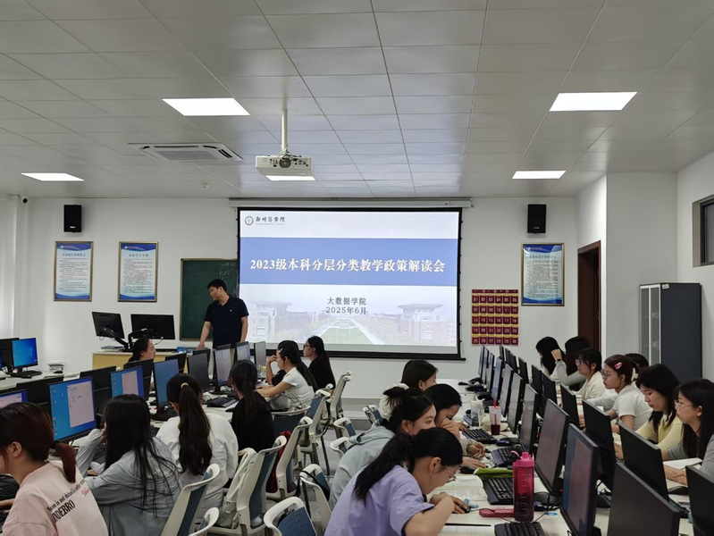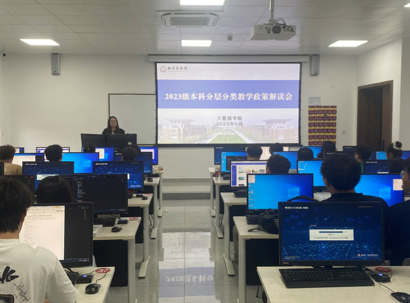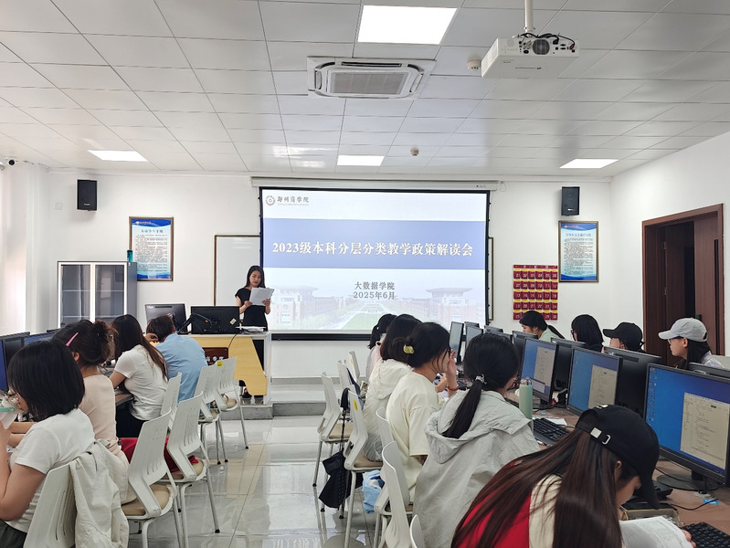 2025年6月5日,大数据学院为深入贯彻“四主两辅”教学改革精神,精准对接学生个性化发展需求,帮助23级学生明确未来方向、科学规划大三、大四学年关键学习路径,学院通过辅导员老师组织全体23级学生召开了分层分类教学政策解读专题班会。本次班会旨在全面介绍我校实施七年的分层分类教学体系,引导学生深刻理解“升学”与“就业”双轨并行的培养模式初衷与核心要求,为即将到来的专业方向分类遴选做好充分的思想准备与学业规划。