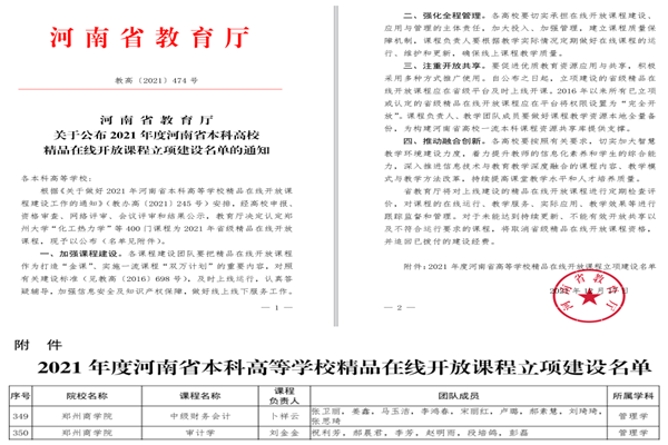 近日,河南省教育厅下发《关于公布2021年度河南省本科高校精品在线开放课程立项建设名单的通知》(教高〔2021〕474号),我校《中级财务会计》、《审计学》2门课程认定为河南省本科高等学校精品在线开放课程。