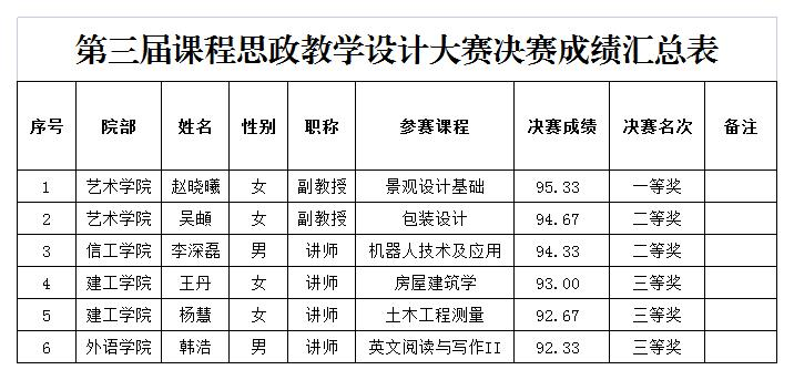 为贯彻落实教育部《高等学校课程思政建设指导纲要》文件精神,聚焦立德树人根本任务,营造浓厚的课程思政改革氛围,传播课程思政教学经验,提高课程思政育人能力,按照本学期课程思政建设总体安排,我校于2022年3月28日-2022年4月24日举办了第三届课程思政教学设计大赛。经院部初赛选拔,共推选17位教师参加学校决赛,经评委现场评议,评选出一等奖1名,二等奖2名,三等奖3名(见下图),优秀指导专家:马克思主义学院邢克鑫,优秀组织奖:艺术学院。现予以公示,公示期3个工作日(4月25日至4月27日)。