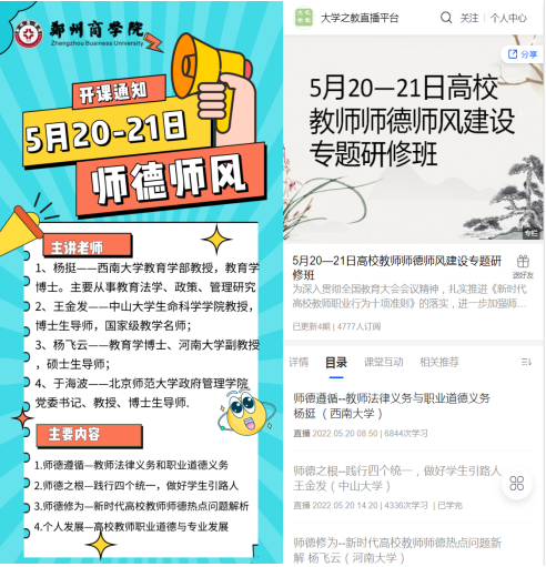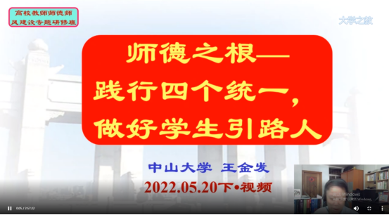 为进一步加强师德师风建设,全面提升我校教师思想政治素质和职业道德水平,我校于5月20-21日组织开展“高校教师师德师风建设”高级研修班线上专题培训。根据疫情防控需要,本次培训依托大学之教直播平台采取线上培训形式,全体专任教师参加培训。