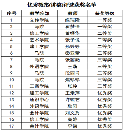 根据我校课堂教学质量提升年专项行动及本学期期中教学检查工作安排,教务处组织开展优秀教案(讲稿)评选活动,在各院部推荐和教务处初审的基础上,选定17位教师的教案(讲稿)参与此次评选。结合校级教学检查小组、教务处、质评中心以及网络投票结果,评选出一等奖2名、二等奖3名、三等奖6名、优秀奖6名(名单附后),现奖获奖名单予以公示,公示期为5月23日至6月1日。