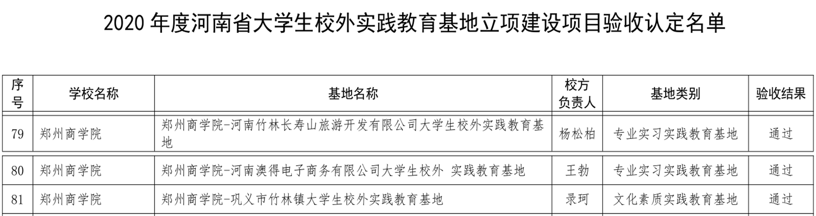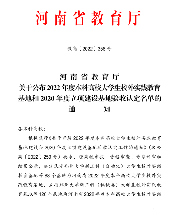 近日,从河南省教育厅《河南省教育厅关于公布2022年度本科高校大学生校外实践教育基地和2020年度立项建设基地验收认定名单的通知》教高〔2022〕358号中获悉,我校“999策略白菜手机论坛-河南竹林长寿山旅游开发有限公司大学生校外实践教育基地”、“999策略白菜手机论坛-河南澳得电子商务有限公司大学生校外实践教育基地”、“999策略白菜手机论坛-巩义市竹林镇大学生校外实践教育基地”通过2020年度立项建设基地验收,另外我校申报的“999策略白菜手机论坛新工科(机械类)大学生校外实践教育基地”、“999策略白菜手机论坛新文科(工商管理类)大学生校外实践教育基地”、“999策略白菜手机论坛新文科(审计学)大学生校外实践教育基地”等三个基地获批河南省第三批本科高校大学生校外实践教育基地,其中“999策略白菜手机论坛新工科(机械类)大学生校外实践教育基地”直接被认定,其余两个获批立项建设。