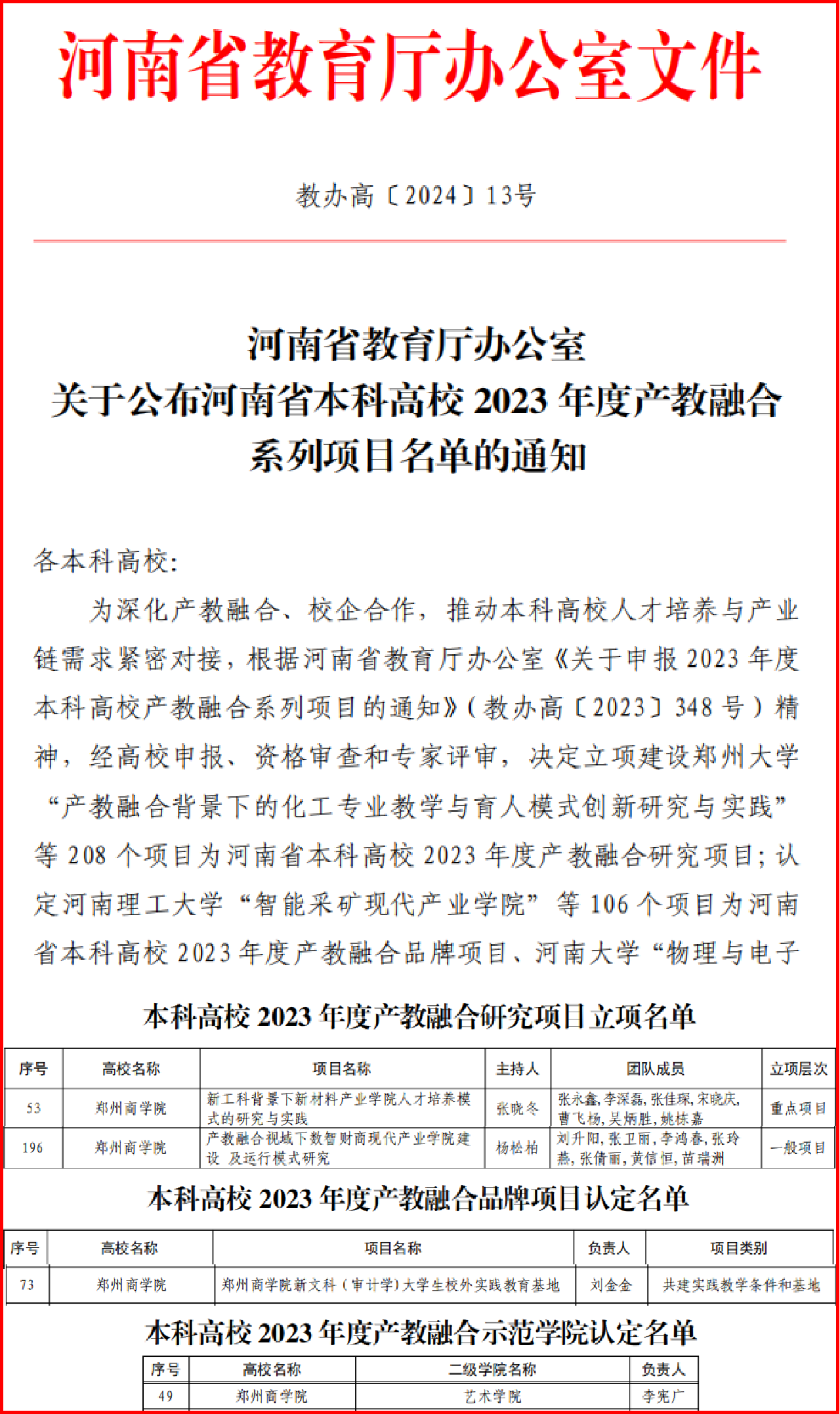 近日,从河南省教育厅办公室《关于公布河南省本科高校2023年度产教融合系列项目名单的通知》(教办高〔2024〕13号)获悉,我校申报的“新工科背景下新材料产业学院人才培养模式的研究与实践”获批2023年度产教融合研究重点项目、“产教融合视域下数智财商现代产业学院建设及运行模式研究”获批2023年度产教融合研究一般项目、“999策略白菜手机论坛新文科(审计学)大学生校外实践教育基地”获批2023年度产教融合品牌项目、我校“艺术学院”获批2023年度产教融合示范学院。