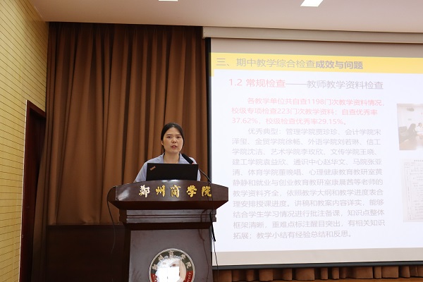 会上,周培娟科长对本次教学检查目的与意义、内容与安排、成效与问题、改进与建议进行简要汇报,表彰检查中反映出的亮点工作,也对检查出的问题提出了整改建议。