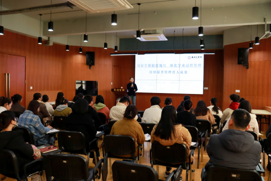 本次会议围绕规范学籍管理、严格成绩管理等方面进行培训,会上王丹科长首先对学籍管理中的三大注册、学籍异动、学籍信息变更;学历学位管理中的毕业资格审查、毕业生学位授予资格审查、新增学位授予上报;成绩管理中的课程与考核、成绩录入、重补修手续办理及学籍异动学生课程核查等方面进行了详细介绍。接下来结合工作经验通过案例分享对各个环节中易忽视、遗漏、出错的点做了重点强调和细致说明。最后强调学籍学历及成绩管理工作“原则性强、工作弹性小、时效要求严格、不允许出错”,希望各学院积极配合相关工作,在对学生的学业管理中“管理有制度,服务有温度,育人有成效”。