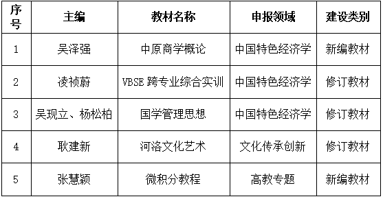 根据《河南省教育厅办公室关于开展河南省第二批普通高等教育“十四五”规划教材建设工作的通知》的文件要求,我校开展了校内教材立项申报及评审工作,在各单位申报推荐的基础上,经校教学指导委员会评审,现对我校推荐申报河南省第二批“十四五”规划教材结果予以公示,公示排名不分先后,具体见下表: