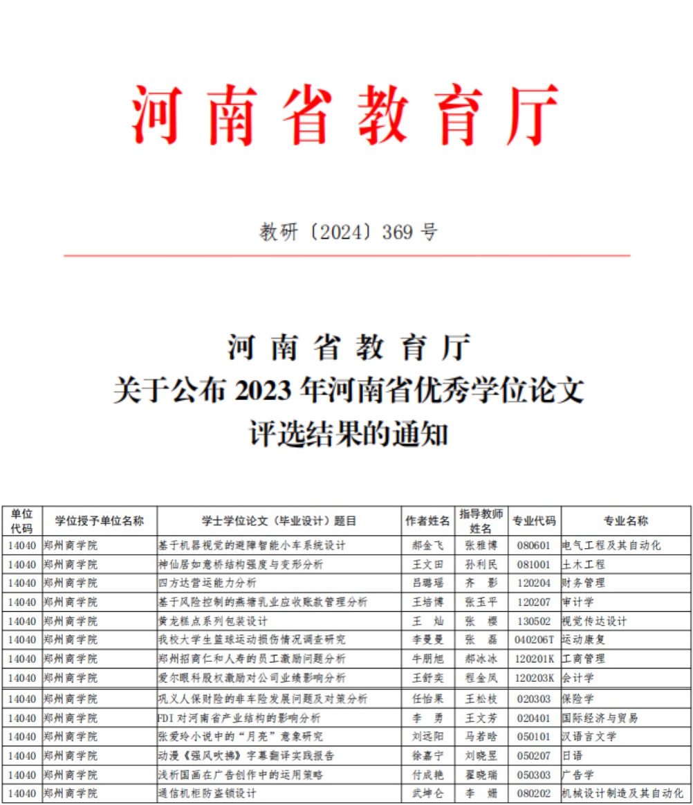 近日,河南省教育厅发布《关于公布2023年河南省优秀学位论文评选结果的通知》(教研〔2024〕369 号),我校金融与贸易学院保险学专业任怡果、文学与新闻传播学院汉语言文学专业刘远阳等14名学生的毕业论文(设计)获评2023年河南省优秀学士学位论文(设计)。