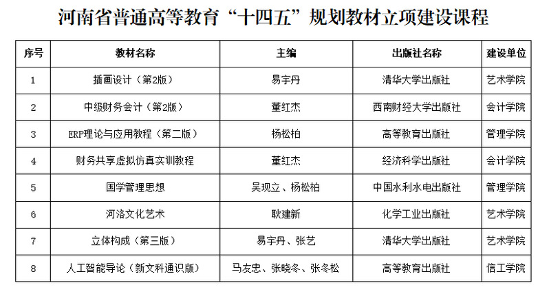近期,河南省教育厅发布了《河南省第二批普通高等教育“十四五”规划教材立项建设名单》(教高〔2025〕27号)。我校管理学院、信工学院和艺术学院申报的《国学管理思想》《人工智能导论(新文科通识版)》《河洛文化艺术》《立体构成(第三版)》4部教材成功入选重点关键领域系列核心教材建设项目。截至目前,我校共计8部教材入选河南省“十四五”普通高等教育规划教材。