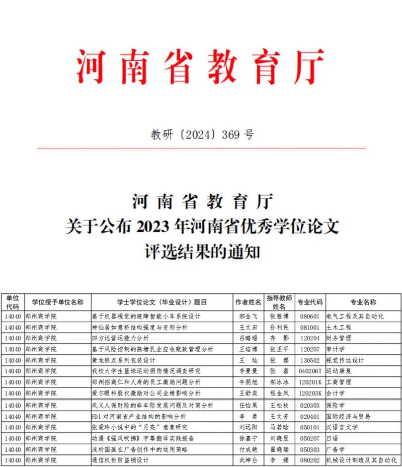 近日,河南省教育厅发布《关于公布2023年河南省优秀学位论文评选结果的通知》(教研〔2024〕369 号),我校金融与贸易学院保险学专业任怡果、文学与新闻传播学院汉语言文学专业刘远阳等14名学生的毕业论文(设计)获评2023年河南省优秀学士学位论文(设计)。