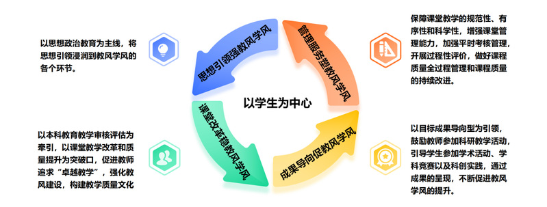 学院在推进教风学风建设过程中,紧紧围绕思想政治教育这条生命线,将思想引领浸润到教风学风建设的各个环节。积极搭建多元交流平台,通过召开教风学风协同建设推进会,教学成果表彰大会,教师、学生座谈会,优秀学生信息员表彰大会,凝聚起教师与学生在教风学风塑造上的强大合力,力促教学相长的优良生态形成。同时学院营造良好教风学风的文化氛围,制作考研答疑信箱,学业第一名展示,考研激励语,手机入袋宣传语等,突出学习文化氛围建设。