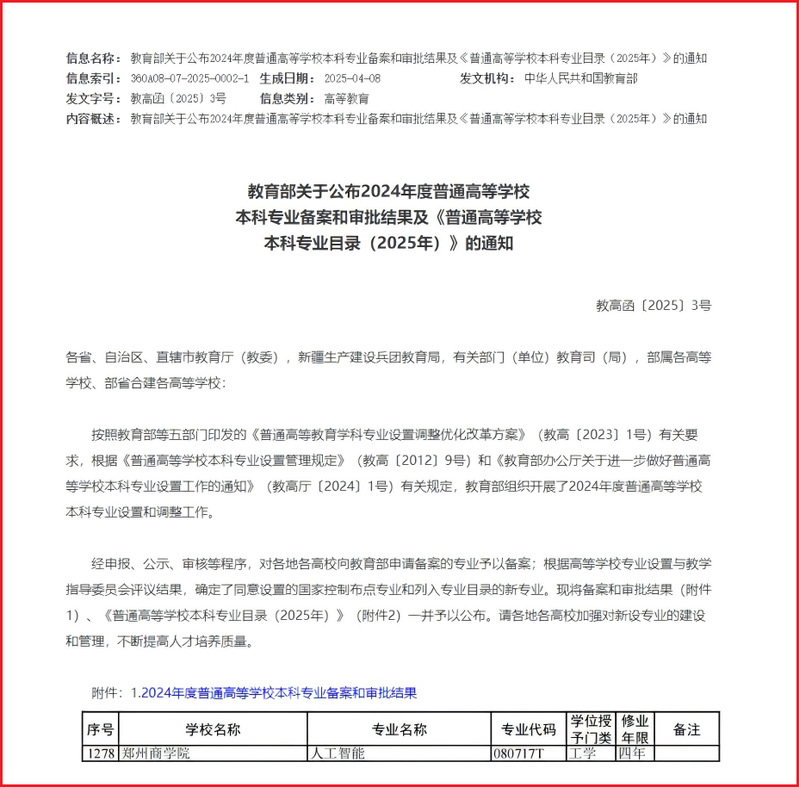 近日,教育部公布了2024年度普通高等学校本科专业备案和审批结果,我校申报的人工智能本科专业成功获批。