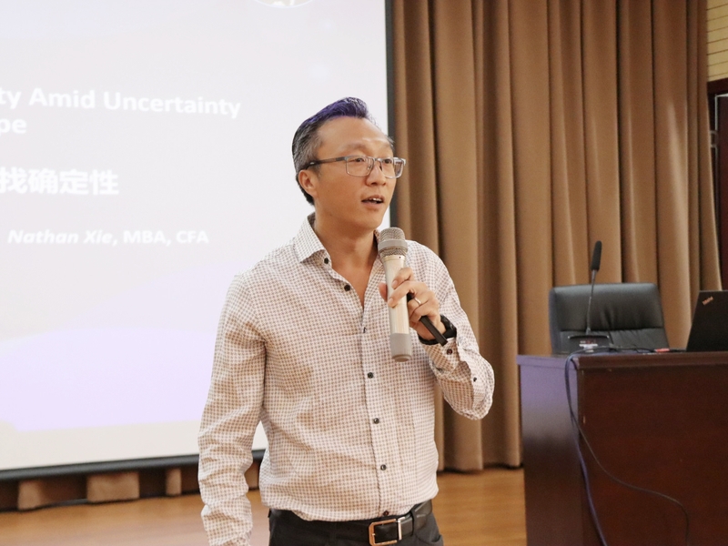 为深入贯彻落实“国际化”与“商科+”的专业建设目标,推动我院投资学、金融科技、数字经济等专业与国际经贸前沿深度融合,进一步深化专业内涵建设,培养具有全球视野、创新精神和实践能力的复合型商科人才。5月12日上午,我院特邀Sinobec集团首席财务官(CFO)兼首席投资官(CIO)谢纳在图书馆5楼学术报告厅开展《美国关税冲击:在不确定性中寻找确定性》学术报告,校外广西冠峰农资有限公司总经理柳冠名、广西勤和泰农资有限公司总经理韦雄耀,学校副校长刘升阳教授,我院院长梁鹏及200余名师生参加报告会,报告会由梁鹏院长主持。