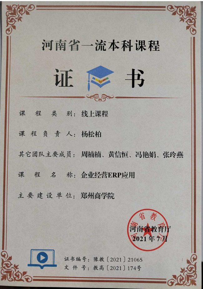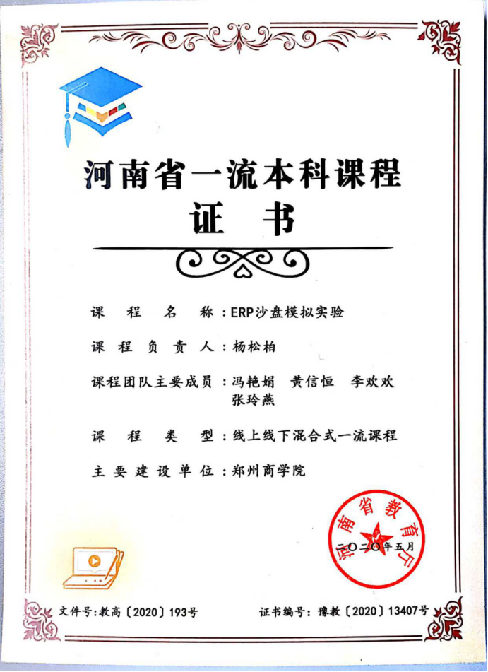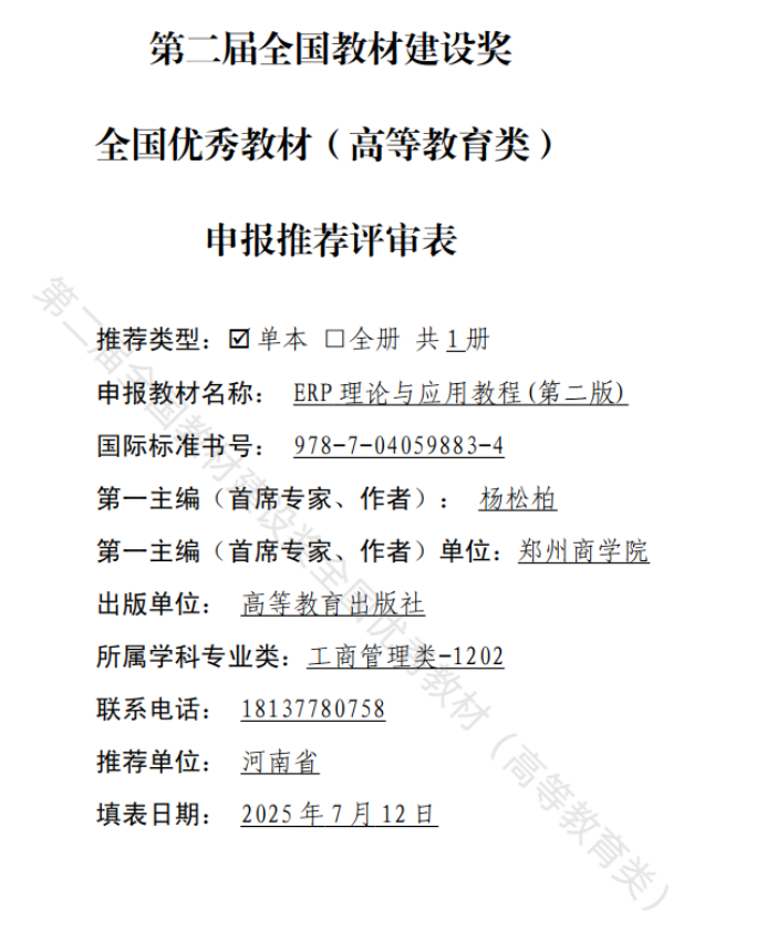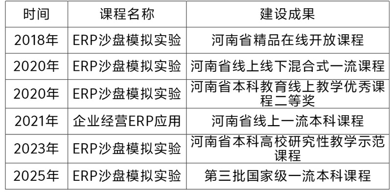 该教材2020年获评河南省“十四五”规划教材、2021年在河南省首届全省教材建设奖评选中获二等奖,并于2024年获推申报“十四五”国家级规划教材、2025年获推参评河南省教材等级评定暨第二届全国教材建设奖全国优秀教材。该教材的建设成果直接支撑了ERP沙盘模拟实验课程的优化与升级,为其提供了坚实的理论依据和实践指导,推动该课程成功获批河南省精品在线开放课程、省级一流课程,并于2025年入选国家级一流本科课程,实现了教材与课程协同共进、理论与实践深度融合的育人新生态。