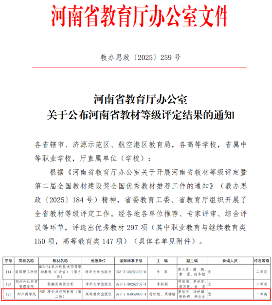 2025年10月10日,由我校管理学院ERP沙盘模拟实验课程组编撰、高等教育出版社出版的《ERP理论与应用教程(第二版)》教材,在河南省教材等级评定中荣获高等教育类二等奖,并将代表河南省参加第二届全国教材建设奖全国优秀教材评选。