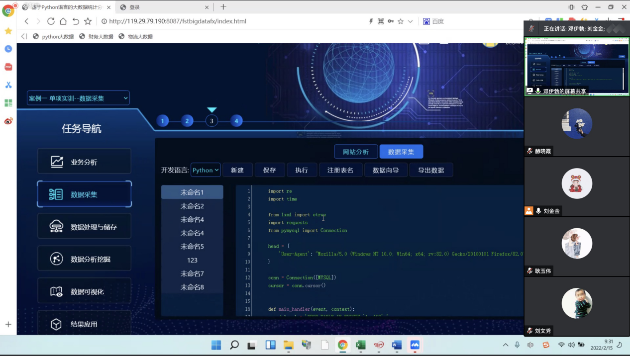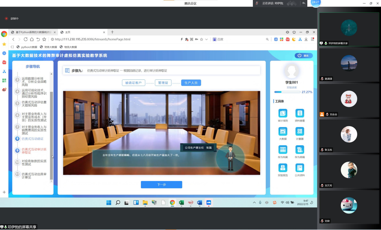会议伊始,祝利芳院长对福思特科技公司的参与表示热烈的欢迎。首先,福思特科技公司的邓伊勃老师介绍了《基于python语言的大数据统计分析虚拟仿真系统》的课程结构,主要分为业务分析、数据采集、数据处理与储存、数据分析挖掘、数据可视化、结果应用六个部分;其次,邓老师指出该课程是以任务为导向,通过完成任务可以帮助老师们掌握数据爬虫、分析等技术,实现理论与实践的深度融合,为“大数据+”奠定基础。接着,邓老师重点讲解了《基于大数据技术的舞弊审计虚拟仿真实验教学系统》,该系统是基于风险导向审计开发的大数据与审计专业相结合的课程,邓老师按照审计流程,详细阐述了每一步骤的操作方法。最后,参会教师积极围绕数据真实性、课程设置、软件之间的勾稽关系等展开提问,邓老师一一详细解答。