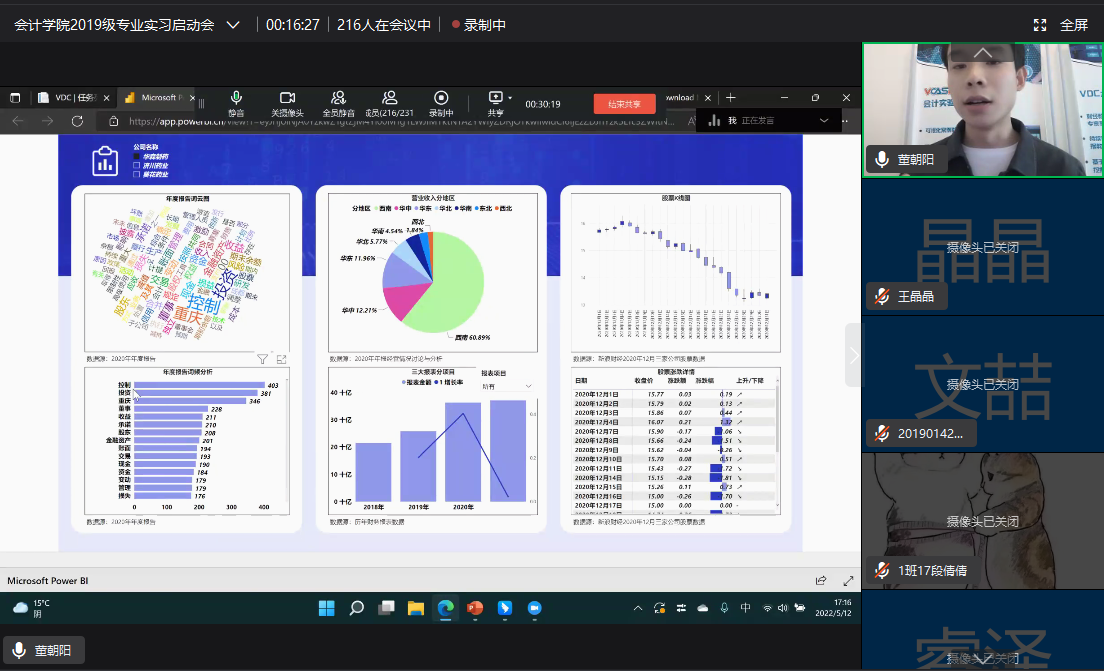 线上专业实习时,跃客科技技术部经理董朝阳为参加专业实习的学生进行专题培训,董经理首先介绍了Power BI工具,并结合具体案例运用Power BI工具对财务数据进行分析处理;其次运用BI工具对具体企业进行杜邦分析:最后通过VDC平台获取数据资源,利Power BI工具进行数据分析。