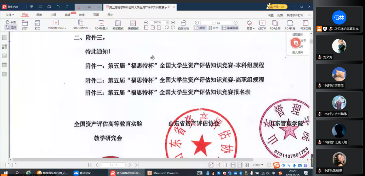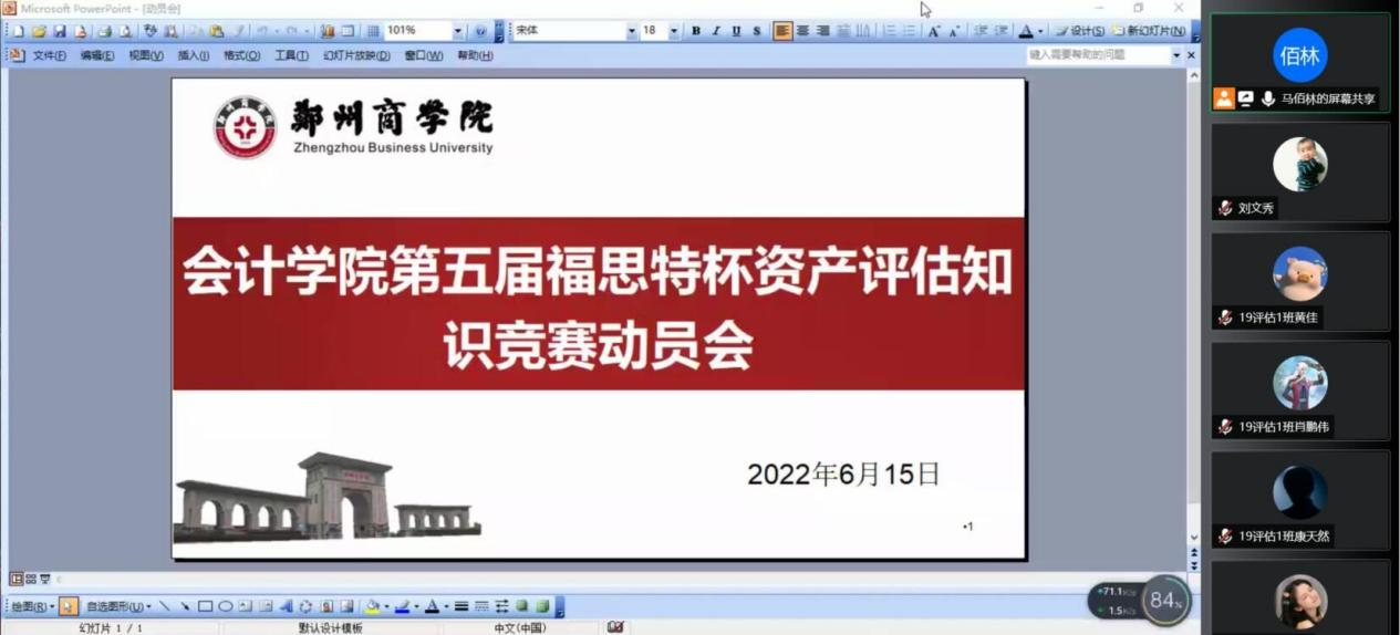 本着“以赛促教、以赛促学、以赛促改、以赛促管”的目的,6月15日晚,会计学院采用线上腾讯会议形式,由马佰林、刘文秀、高艳美三位老师开展了第五届“福思特杯”全国大学生资产评估知识竞赛动员会。