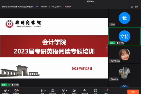 为进一步提升学风建设质量,深入落实我校本科分层分类教学工作要求,加强考研学习指导与服务工作,提升学生考研成功率,2022年8月27日-28日,会计学院邀请外语学院王静老师为2023届考研学生作考研英语阅读专项培训,此次培训由会计学院考研职能组孙文特老师主持,全体2023届考研学生参加会议。