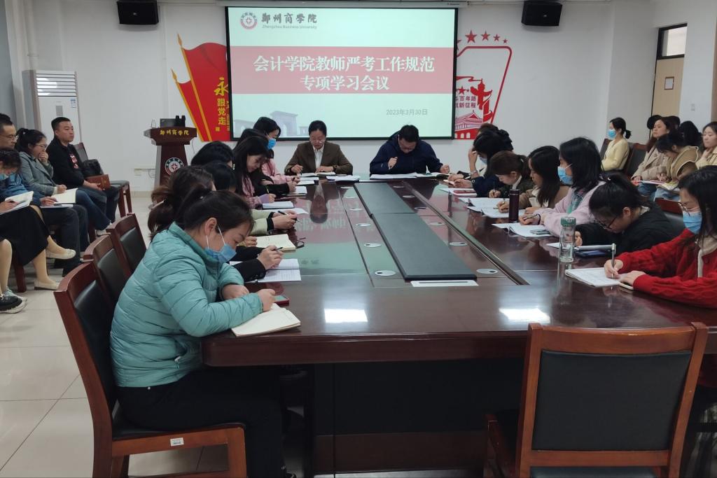 为明确教师的工作职责,规范教师工作行为,增强教师爱岗敬业、立德树人的责任感和自觉性,进一步强化我校“严教”“严考”管理,会计学院于3月30日下午在广恩楼会议室召开“会计学院教师严考工作规范专项学习会议”。参加此次会议的人员为会计学院院长祝利芳、党委书记梁鹏、副院长刘金金、全体无课教师和辅导员。