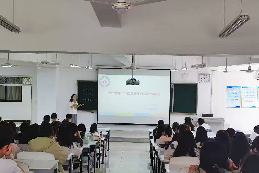 为贯彻落实我校“以学生为中心”的发展理念,充分尊重学生的个性化、差异化需求,因材施教,大力推进实施分层分类教学改革,确保2021级分层分类教学工作顺利开展,6月6日-6月7日下午,会计学院会计教研室苗稳老师在GE104教室开展了2021级会本各班级的分层分类教学政策宣讲,以期帮助学生更好的了解政策,定好未来发展方向。