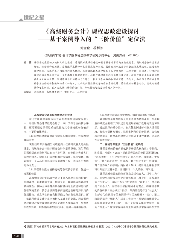 【思政论文】《高级财务会计》课程思政建设探讨——基于案例导入的“三阶价值”定位法