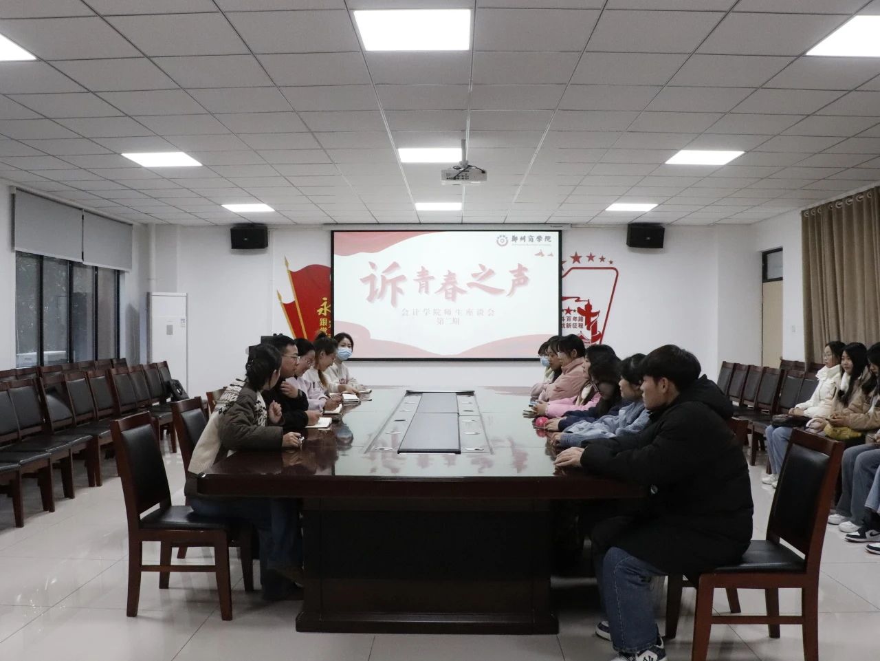 为加强师生之间的沟通交流,更好落实“以学生为中心”的服务理念,倾听学生心声,畅通反馈机制,会计学院成立“听·青年说”辅导员工作室,开展“诉青春之声”系列师生座谈会,11月30日下午,诉青春之声第二期师生座谈会顺利召开。会计学院院长祝利芳、党委书记刘宏涛、团委书记杨茗涵及辅导员代表、学生代表参加座谈会。