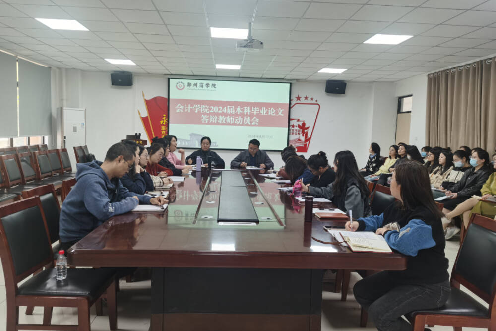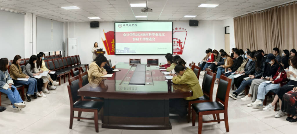 为严格把控2024届毕业生论文质量,确保答辩工作顺利进行,在我院前期召开师生答辩动员会的基础上,4月19日上午,我院在广恩楼103会议室召开了2024届本科毕业论文答辩工作推进会,会计学院院长祝利芳、副院长刘金金、全体论文指导教师参加了此次会议。