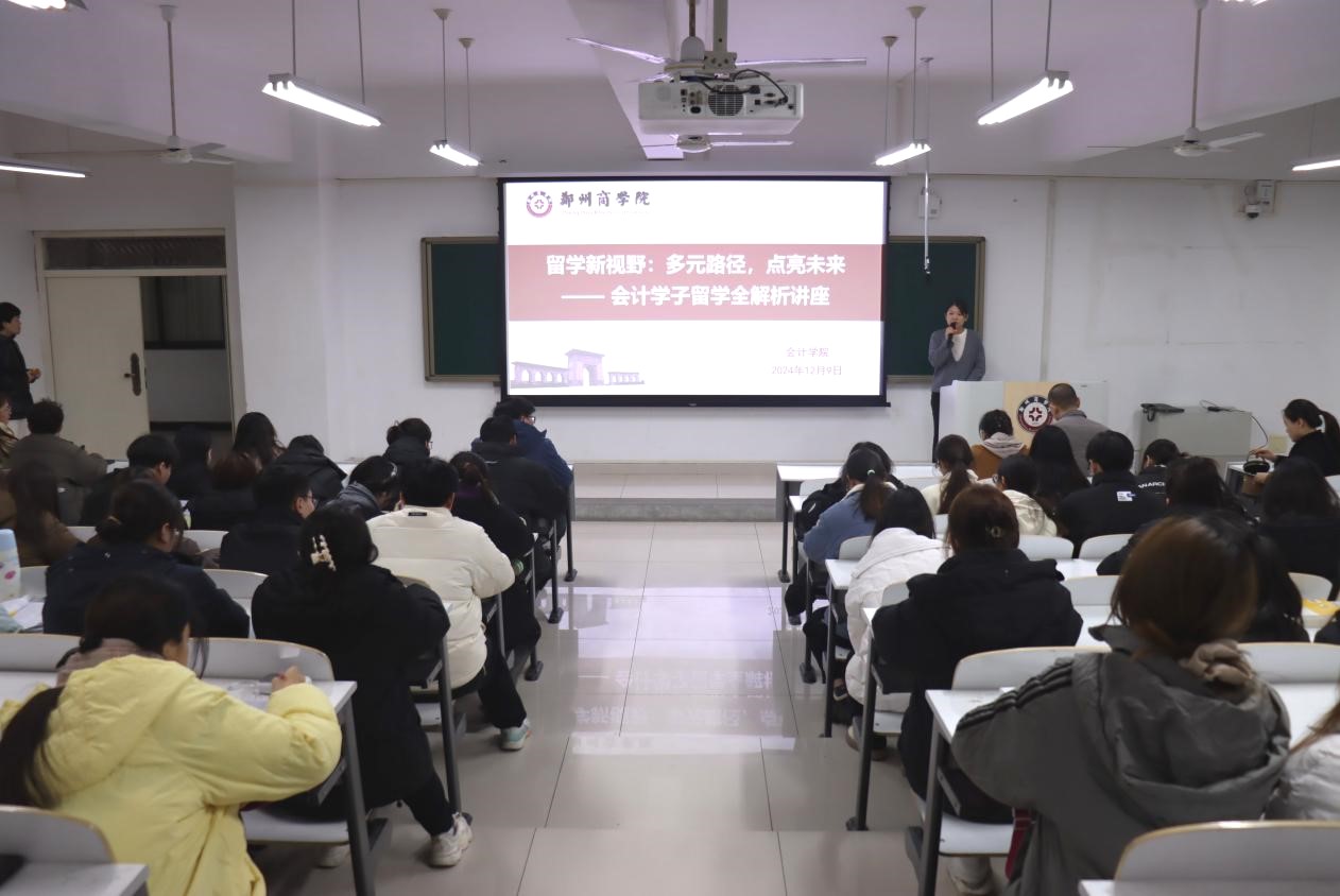 为帮助学生更好地规划留学路径、拓宽国际视野,我院联合国际交流合作处于12月9日在GE104成功举办了主题为“留学新视野:多元路径,点亮未来”的讲座。讲座围绕“留学规划、项目介绍、政策支持、经验分享”四大维度,全面解析会计学子留学的机遇与挑战,为有意向出国深造的学生提供了清晰的指导。我校国际交流合作处赵彦丽处长及骨干教师、我院教师代表以及大二、大三有意向出国深造的学子参加了本次讲座。会议由考研教研室主任武佳莉主持。