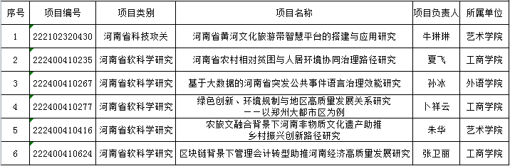 根据河南省科技厅的《关于下达河南省二○二二年科技发展计划的通知》文件,我校6项2022年河南省重点研发和推广专项获批立项,其中河南省科技攻关1项,河南省软科学研究5项。请各课题组认真组织实施课题,按时保质完成研究。