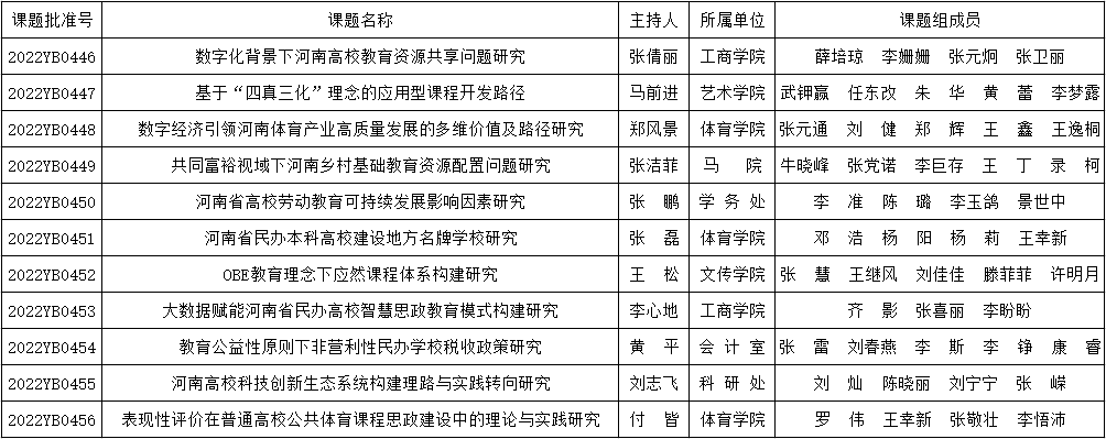 根据河南省教育厅《关于公布河南省教育科学规划2022年度一般课题立项名单的通知》(教教科〔2022〕206号),我校11项河南省教育科学规划2022年度一般课题获批立项。望各课题组深入调查,务实研究,按时保质做好结项工作。