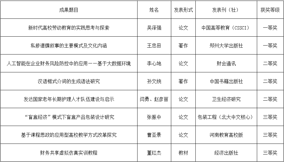 根据市委办公厅、市政府办公厅印发的《郑州市哲学社会科学优秀成果评奖办法》(郑办[2009]40号)的规定,经个人评审、小组评审和专家组集中评审,我校8项成果获郑州市2021-2022年度社会科学优秀成果奖,其中一等奖2名,二等奖3名,三等奖3名。望获奖同仁再接再厉,再创新佳绩!
