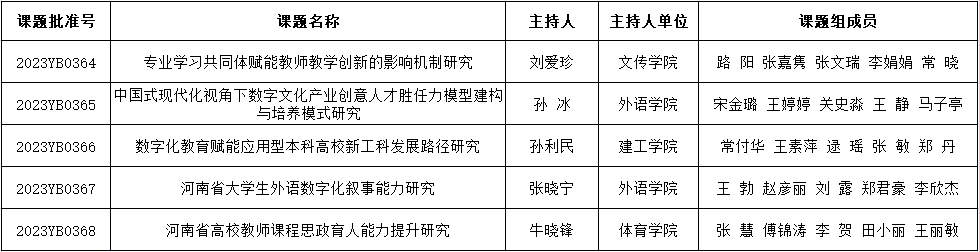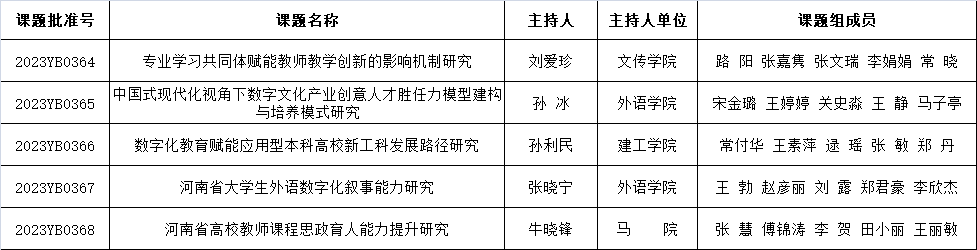 根据河南省教育厅《关于公布河南省教育科学规划2023年度一般课题立项名单的通知》(教教科〔2023〕182号)文件,我校5项河南省教育科学规划2023年度一般课题获批立项。请各负责人认真组织实施,在规定时间内保质保量完成课题研究。