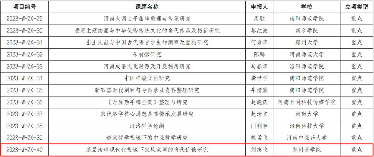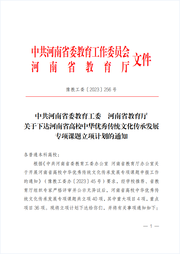 根据《中共河南省委教育工委办公室 河南省教育厅办公室关于开展河南省高校中华优秀传统文化传承发展专项课题申报工作的通知》(豫教工委办〔2023〕45号)要求,经我校推荐、省教育厅组织专家严格评审并公示无异议后,河南省高校中华优秀传统文化传承发展专项课题共立项40项,其中重大项目4项、重点项目36项。在全省20余所民办本科高校中,仅有我校和河南开封科技传媒学院各获批1项。